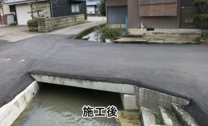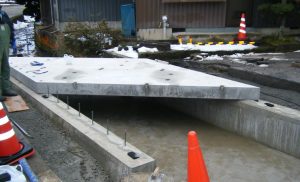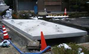 車の往来もあるため、水路にかかる橋の取替え時間短縮のためプレキャスト床版が採用されました。