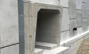 地山が急斜面で現場打ちボックスカルバートの施工が困難であったため、補強土壁のまき出し施工に伴ってプレキャストBOXを順次据付することで施工が可能となりました。また、ボックス配列に段差を設けて、水路勾配を緩くすることが水路内の流速を制御しています。