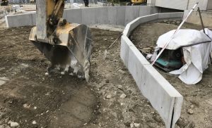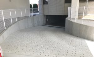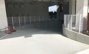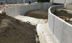 地下への進入路には擁壁が必要ですが、背面側(土側)にスペースがないことがしばしばです。逆L型擁壁とすることで、省スペースで擁壁が構築できました。