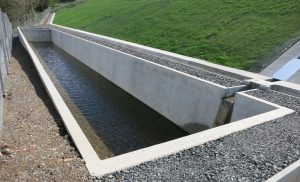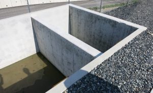 造成計画段階でオープン調整池の平面形状を細長くしていただいたことで、経済性、施工性に優れる大型フリュームを活用できました。本工事は冬期の施工予定で、現場打ちコンクリート造は職人および品質の確保に不安があり、工期短縮および品質確保性に優れるプレキャストが望まれていました。