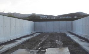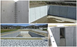 高さ2.8mのオープン調整池は、壁面をプレキャストとすることでシンプルに築造されました。