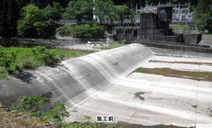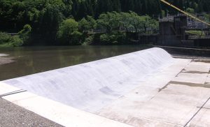 水流や砂礫などで摩耗した固定堰の補修工事です。