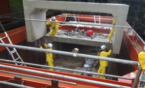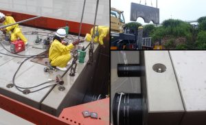 上下分割式のRCボックスカルバートは通常、下部材1⇒上部材1⇒下部材2⇒下部材2…の順に据付しますが、今回配管取付の関係で下部材を全て敷設し、配管取付後に上部材を据付しています。