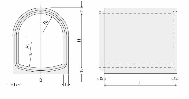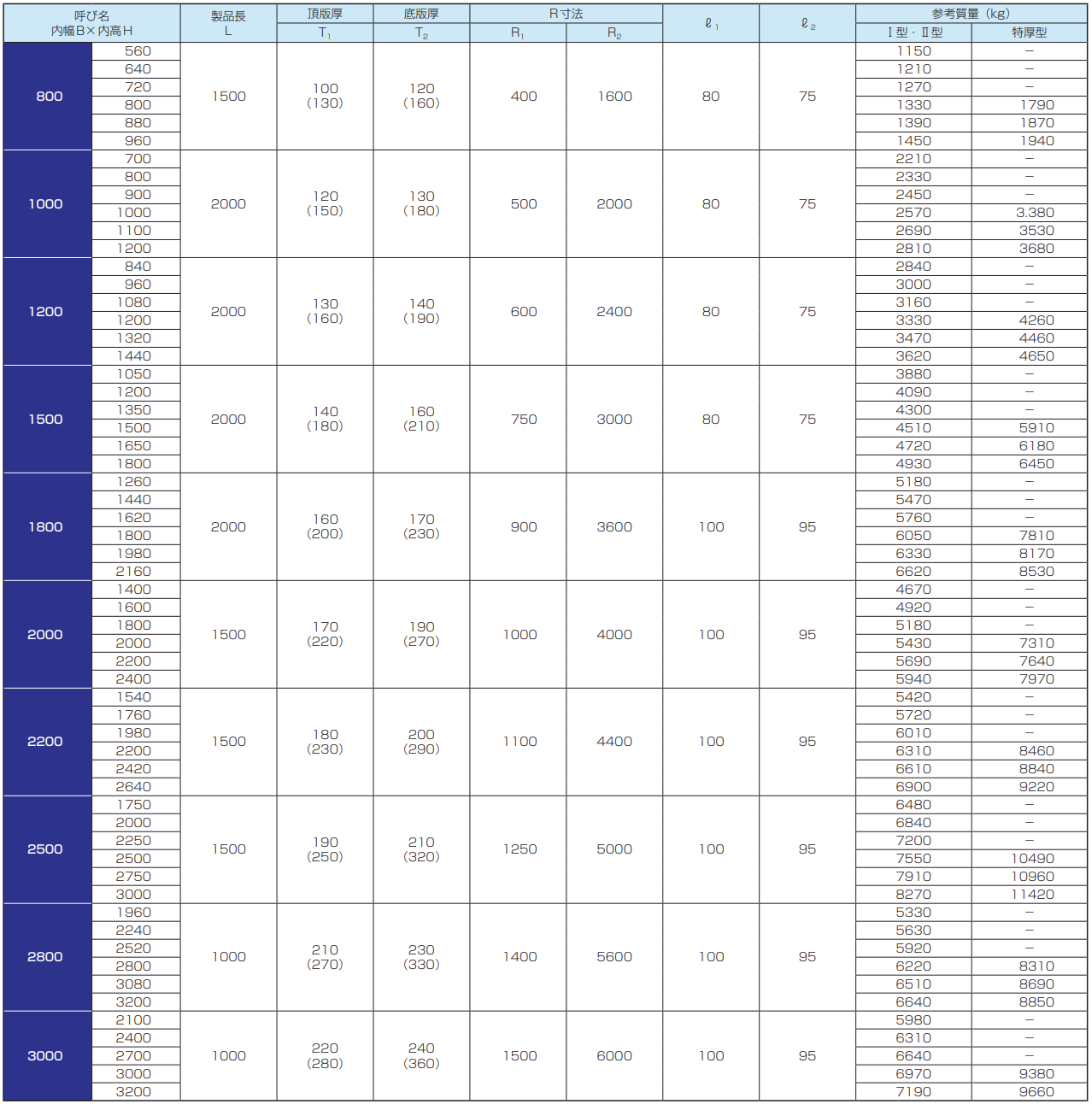 サイズは内幅800〜3000mmの10種があり、それぞれについて内高がI・II型は、内高/内幅比0.7〜1.2の6種類、特厚型は、1.0〜1.2の3種類を用意しております。