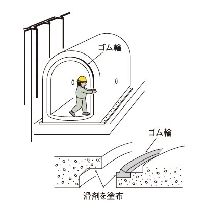 アーチカルバートは、ゴム輪を使用しているため、地盤の多少の不同沈下に対しても、従来のモルタルコーキングと違い、ゴム輪の弾力性による可撓性が発揮され漏水の心配がありません。
