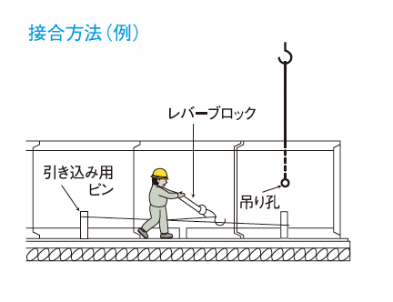 接合するアーチカルバートを、多少吊り上げ気味にし、レバーブロック、チルホール等で引き込んでください。