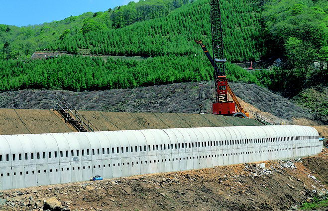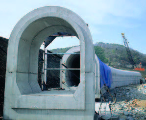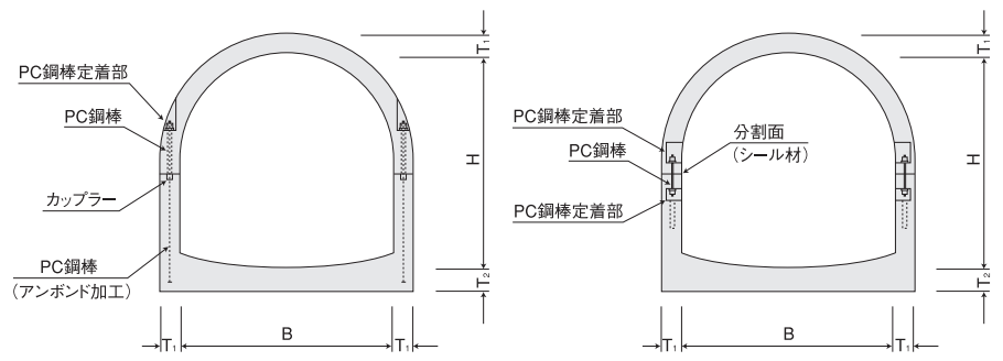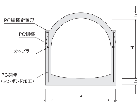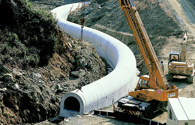 二分割形アーチカルバートは、アーチカルバートの構造的利点を生かし、近年の地下構造物の大型化に対応して、製品を分割生産し現場でPC鋼材にて緊結するもので、強度については工場実験で従来の一体成形品と同等であることが実証されています。