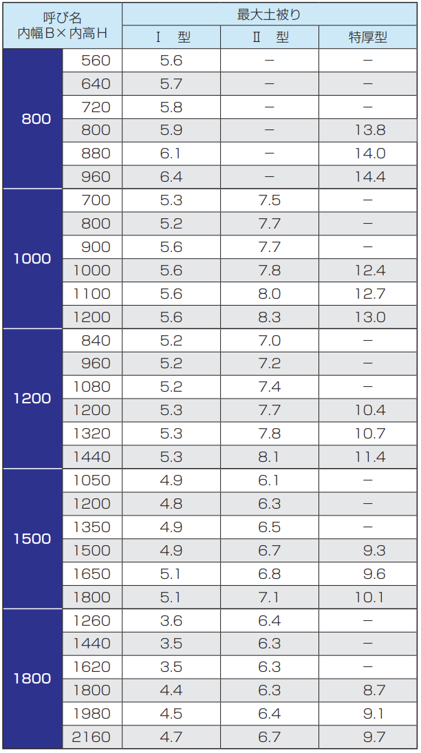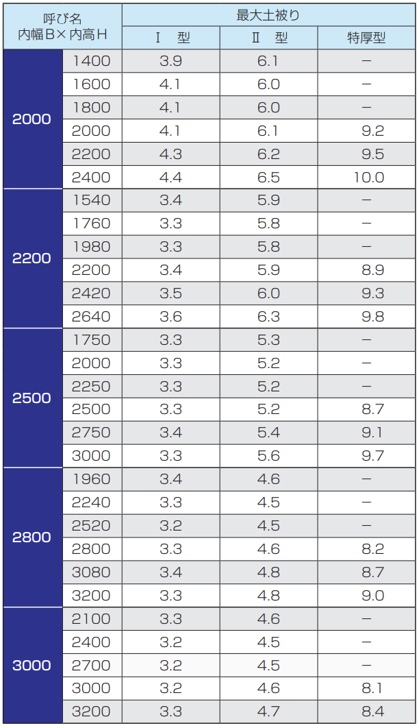 内幅は3500〜5000mm、内高は3500〜5400mm、土被りは3.5m用および8m用を用意しています。