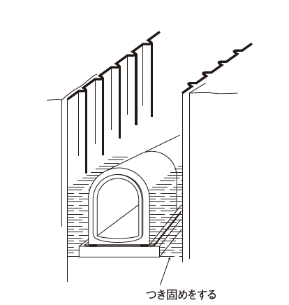 吊り孔は、ゴム栓を打ち込み後、引き込み孔と同じく、モルタル仕上げをしてください。また、継手部のスキ間に化粧目地が必要な場合はモルタル目地を施してください。