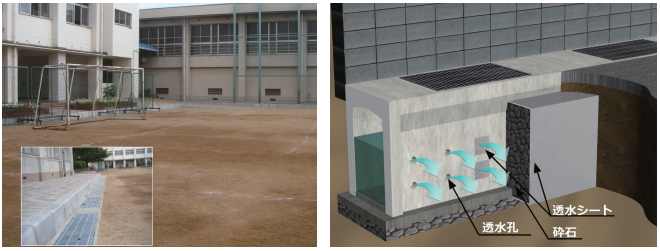 公園や駐車場、校庭のグラウンド外周に貯留槽を設けたい場合は、側溝用の製品を転用して流出抑制施 設として使用できます。浸透機能を付加させる対応も可能です。