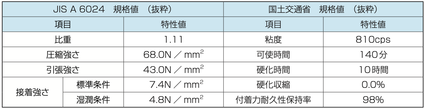 ❷ 国土交通省土木補修用エポキシ樹脂注入材1種に適合しています。