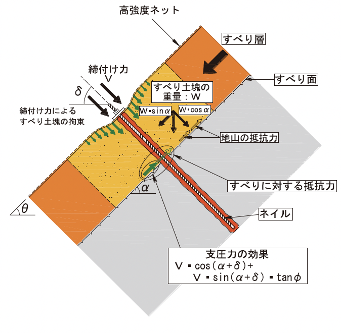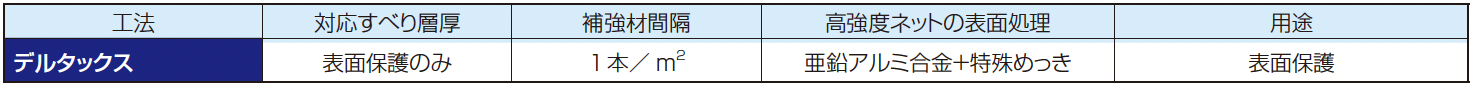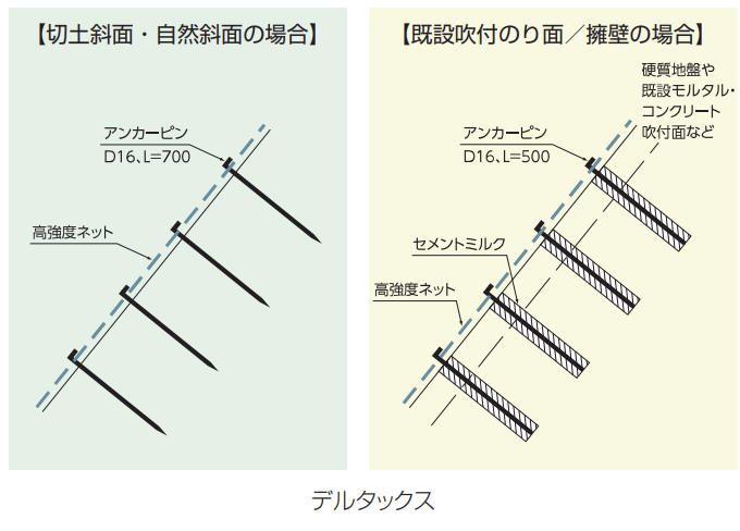 高強度ネットとアンカーピンを組合せることで、のり面の表 面保護対策や、既設吹付のり面の表面剥離・脱落対策として 使用することができます。