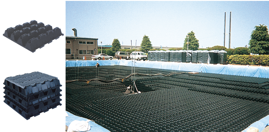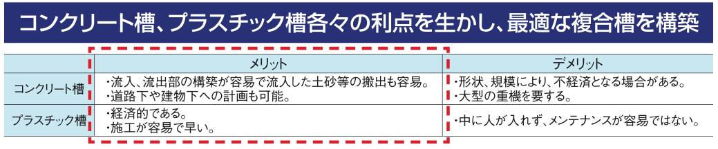 複雑な形状や狭い用地でも、プレキャストコンクリート貯留槽とプラスチック貯留槽を自在に組合せることができます。