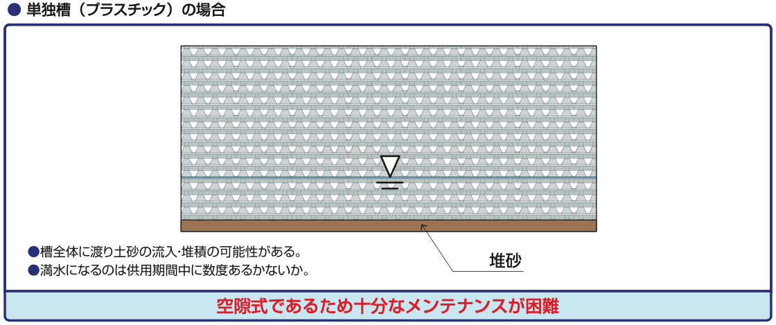 流入土砂は設計によりプレキャストコンクリート貯留槽に堆積させることが可能なため、施設全体の維持管理が容易になります。