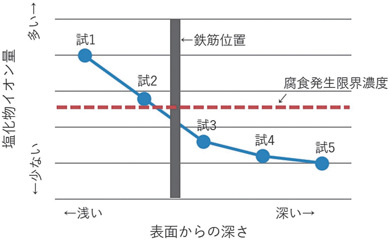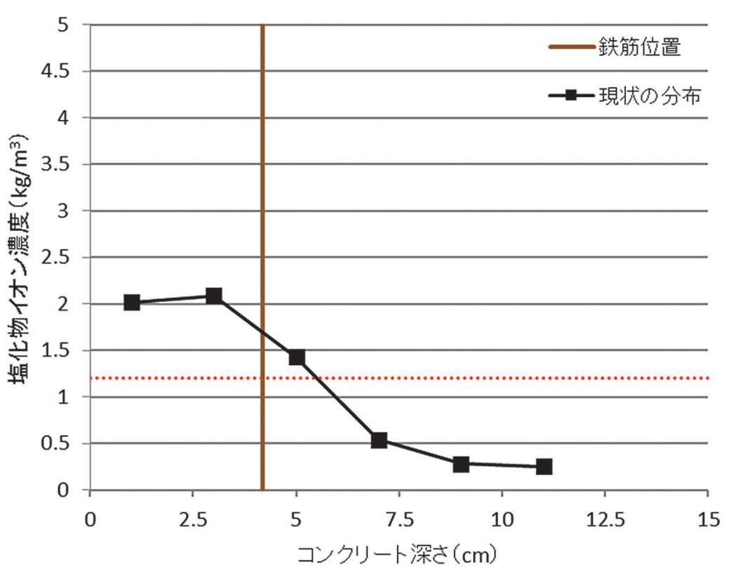 深さ毎の塩分浸透状況を把握することで、どの深さまで補修が必要かを判断できます。また、将来の浸透予測や、効率的かつ効果的な補修計画の立案に役立ちます。