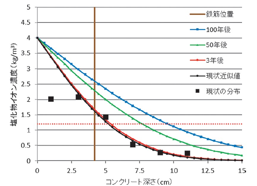 試料採取深さと塩化物イオン量の関係から見かけの拡散係数を算出