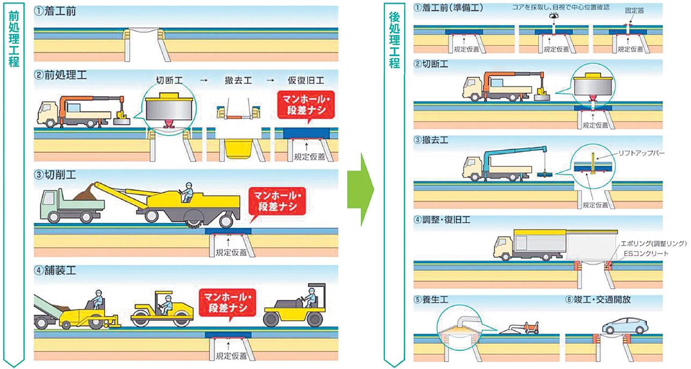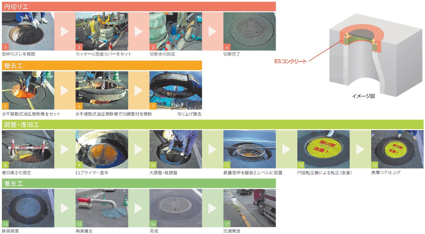 基層部・表層部の調整工程に、プレキャストのエポリングや独自開発の材料であるESコンクリート(エポキシ系レジンコンクリート)を使用しマンホール周囲の耐久性を大幅向上。
