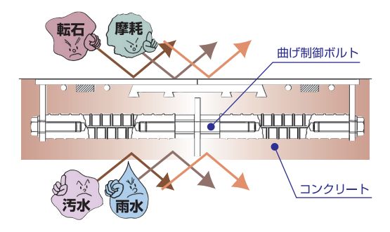 可とう部品がコンクリートに埋め込まれているので、錆びによる肉厚の変化がなく初期強度を恒久的に維持します。また施工時(推進時)の磨耗や転石による損傷を受けません。