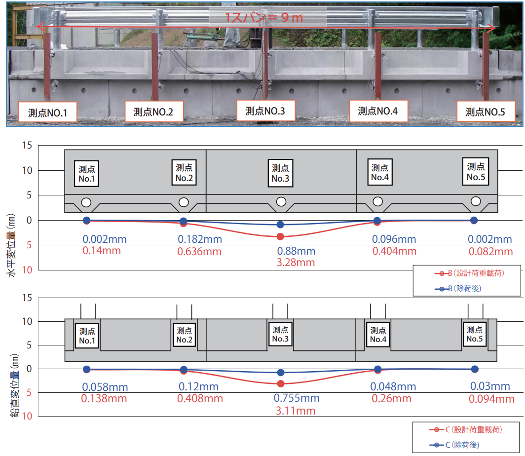② 変位結果から、鉛直変位量は3mm程度であり、設置仕様の中空部(10mm)を設けることで下部構造物に影響を与えることはないことが確認できた。