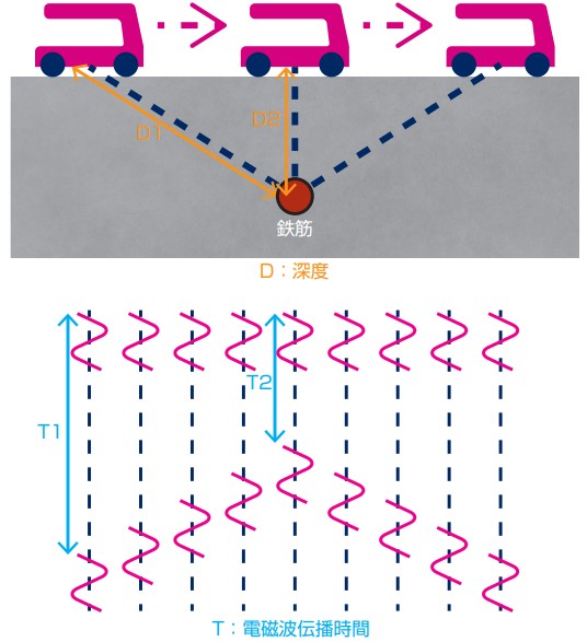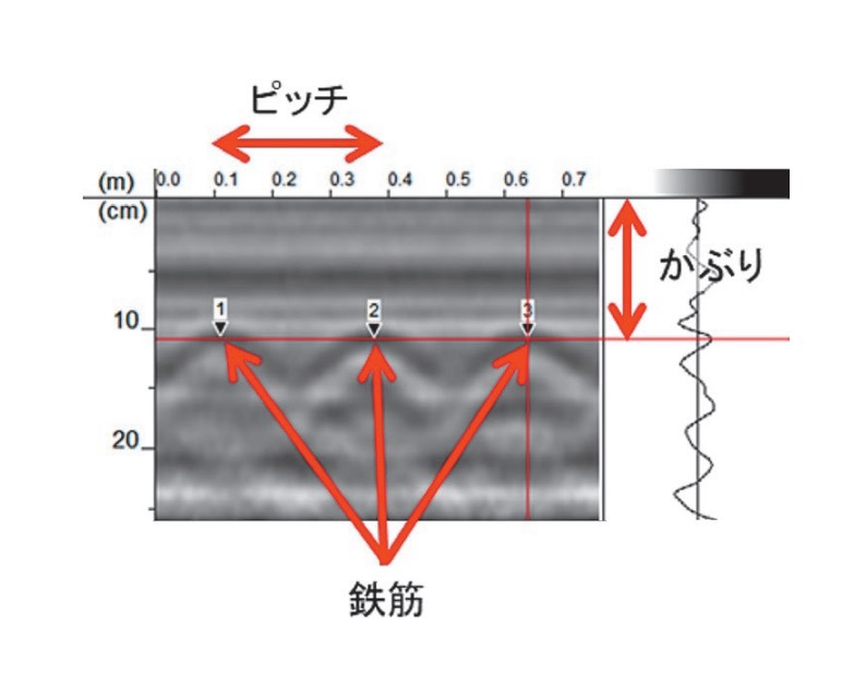 波形が鉄筋を示す。ピッチ、かぶりを確認