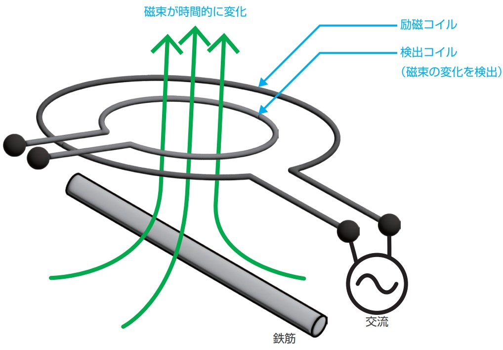 励磁コイルに電流を流し発生した磁界内の鉄筋があると、過電流が発生します。この過電流により磁場が誘導され、鉄筋の位置、かぶり厚さを測定します。
