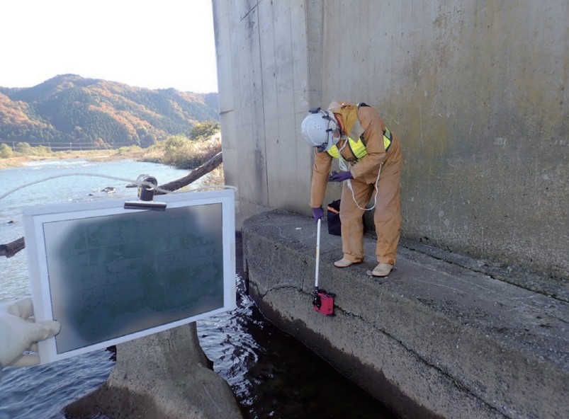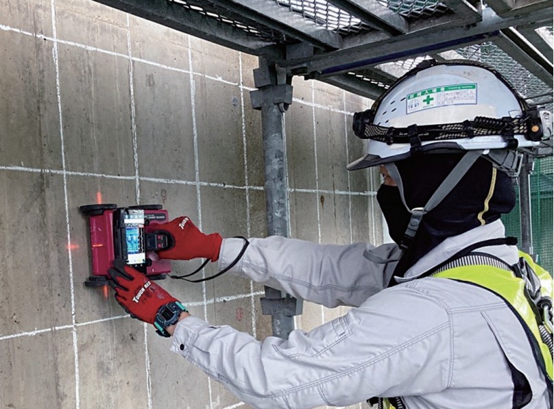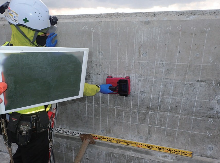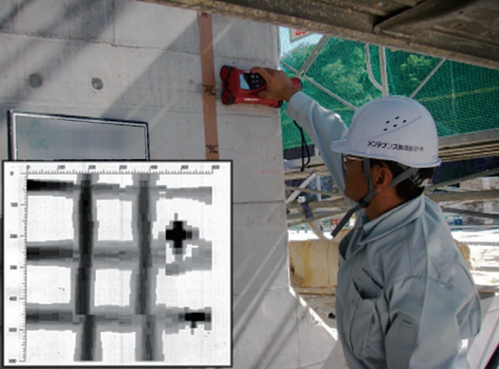 電磁波を用い、鉄筋の境界面で反射した電磁波を受信することで、鉄筋の位置、かぶり厚さを測定します。比較的深い場所まで探査可能です。