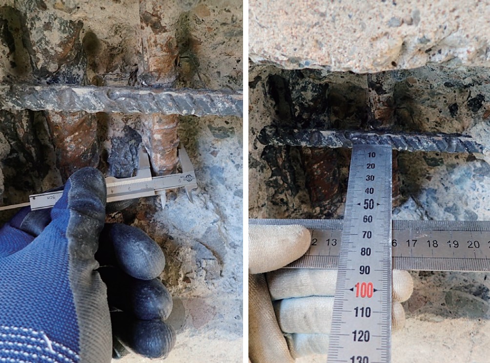 鉄筋をはつり出し、鉄筋の種別、径、かぶりを実測します。