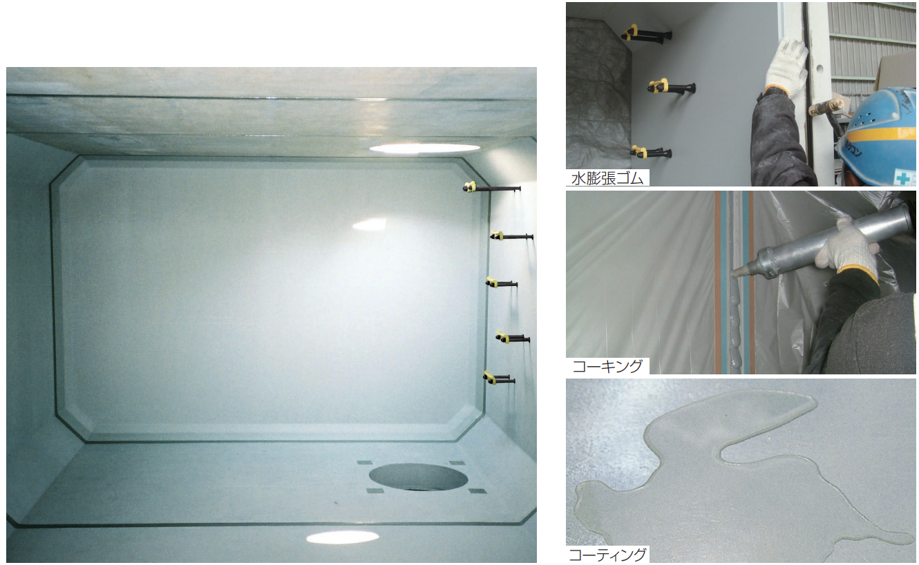 部材接合部は水密性の優れた水膨張ゴムと特殊コーキング材を施す二重防水構造、内壁にはオリジナルエポキシ樹脂によるコーティングを行い、高い防水性能を実現しました。