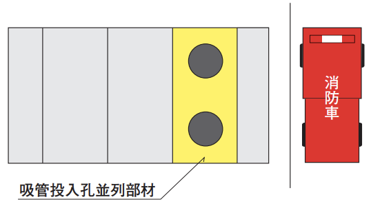 Aタイプについて、一つの部材に吸管投入孔を並列に2個設けた部材を用意しています。 消火活動の際の消防車側に使用することで円滑な消防活動が行えます。