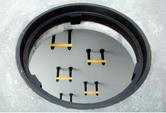 土被りゼロに対応できる「HC式」独自の仕様です。鉄蓋の受枠を本体部材に埋め込み、一体成型しています。