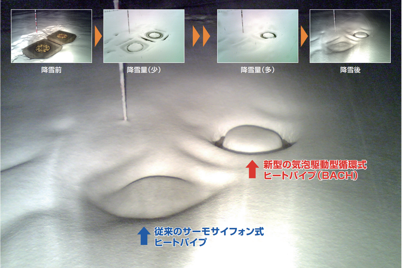 フィールド実験で、カメラを設置し融雪状況を確認。各写真の右側の鉄蓋がBACHを使用したシステム、左側の鉄蓋は、従来のサーモサイフォン式ヒートパイプを使用したシステムで、水槽の中の温度は10℃程度、外気温は氷点下5℃程度と低温度差でありながら、ヒートパイプは常時作動し、融雪を行っている。断続的な強い降雪もあり、積雪は、最終的に1mを超えていたが、右側の鉄蓋上部が周辺より窪んでいるのが写真でも確認できる。また鉄蓋の受枠温度も冬季期間中0℃を下回ることがなく、コンクリートパネルに接している雪もシャーベット状で受枠も凍結していなかった。