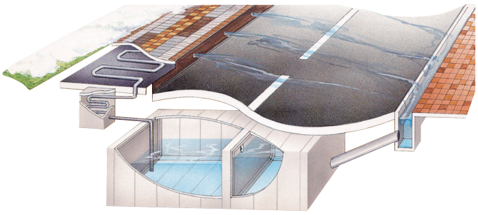 ❶ 地中熱で温められた水槽の水を熱源とし防火水槽鉄蓋周辺の融雪を行う無動力のシステムです。