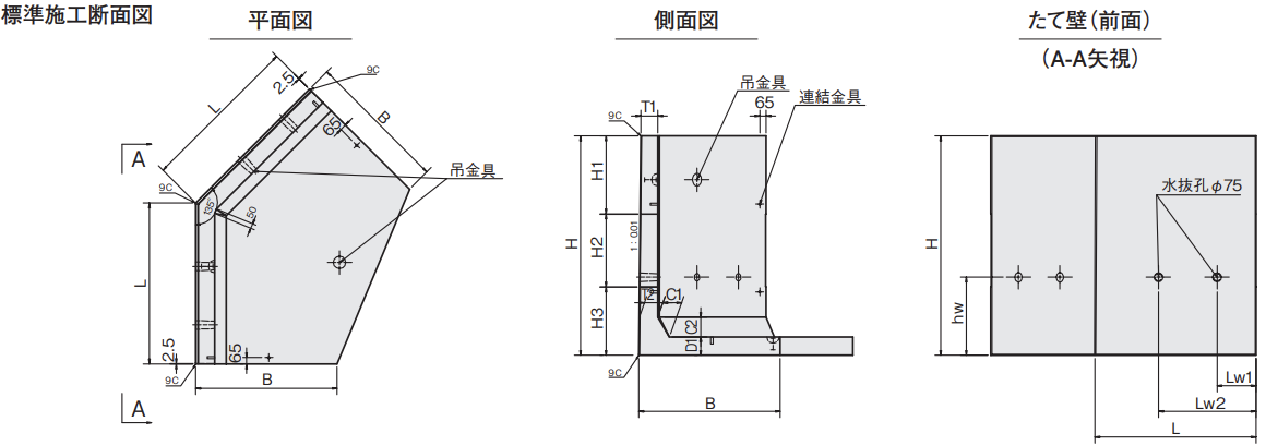 隅角部の施工は、プレキャスト製品の使用可能な箇所については、プレキャスト製品を使用し、それ以外の箇所は『宅地防災マニュアル解説・解説編Ⅰ』に従って、現場打ち構造としてください。