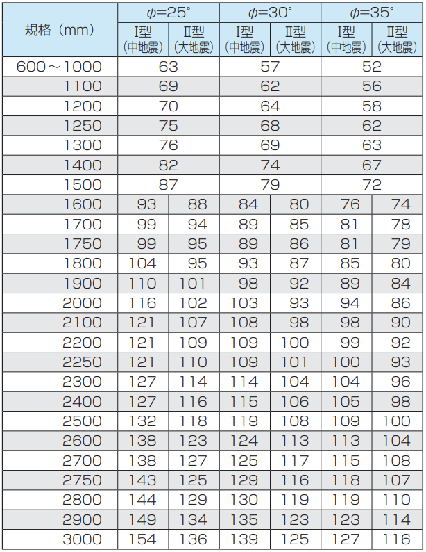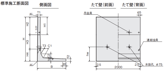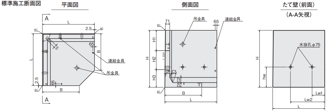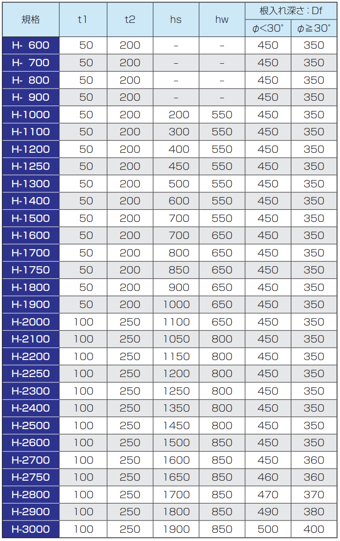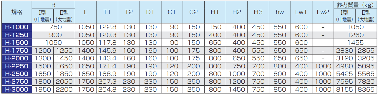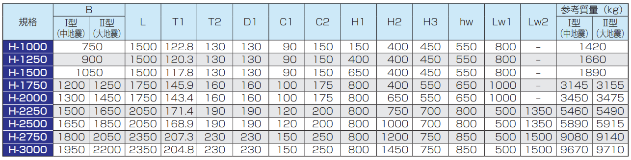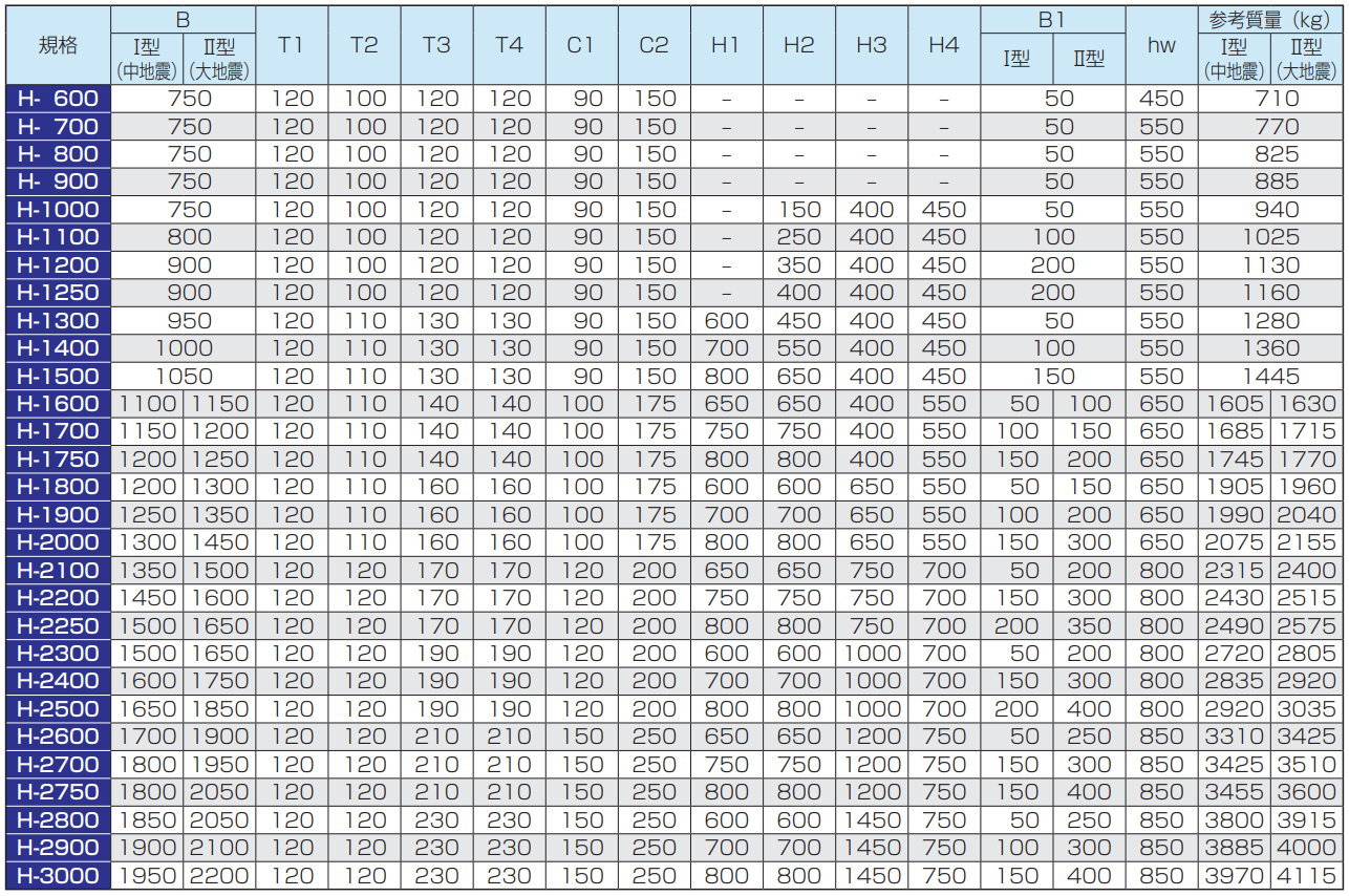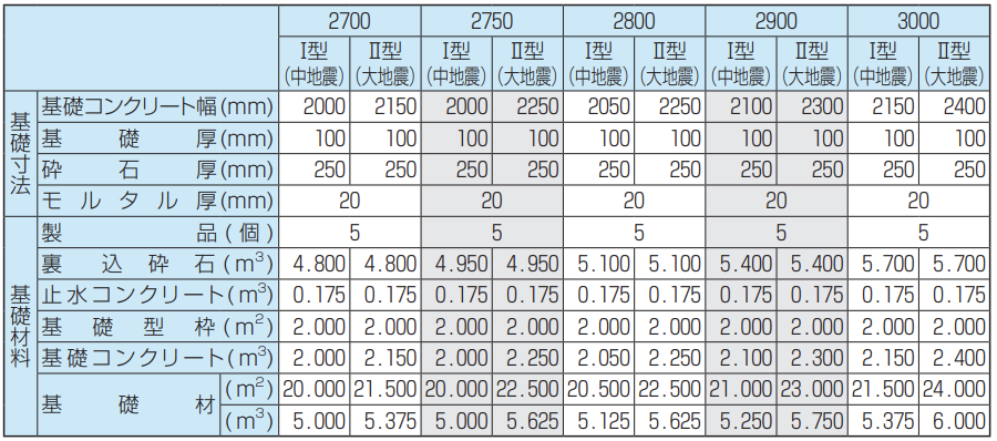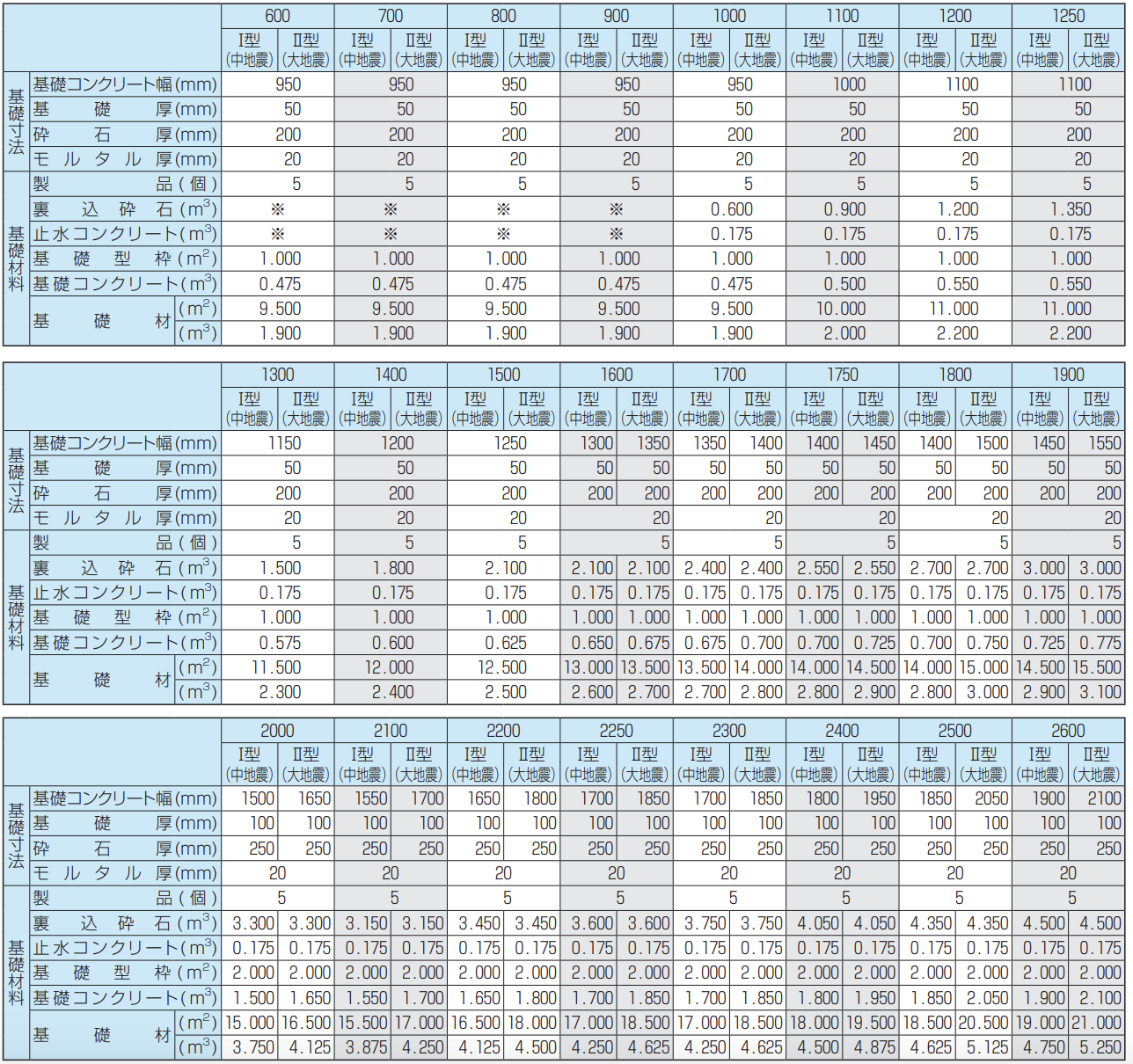 ※ H-2750(Ⅱ型)および3000(Ⅱ型)については、底版ブロックを含めた数値を示す。