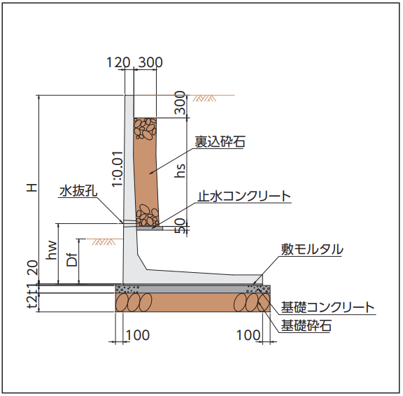 HDウォールの構造にあたっては、背面及び基礎地盤の土質条件により築造方法などが異なりますので、施工場所の土質を十分に把握してください。