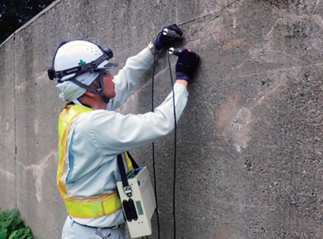 超音波測定器を用いて、コンクリート表面のひび割れを挟むように設置した発信センサーから受信センサーへ超音波を伝播させ、回析波を受信することによりひび割れ深さを推定します。