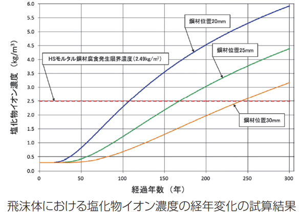 HSモルタルS12の塩化物イオン拡散係数は、W/C=30%の普通セメントを用いたコンクリートの約1/20であり、飛沫体(コンクリート表面塩化物イオン濃度13.0kg/m3)における100年経過後の各鋼材位置(かぶり)での塩化物イオン濃度の経年変化を試算した結果、鋼材位置が20mmであっても、HSモルタルの鋼材腐食発生限界濃度(2.49kg/m3)に達するのは100年以降となることが確認されました。