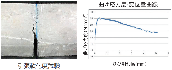 HSモルタルS12において、部材厚2/3の切りこみを入れた曲げ試験体を作成し、変位量を測定しながら曲げ試験を実施しました。最大応力度25.4N/mm2で、ひび割れ幅0.92mmまで応力度24N/mm2以上を保持し、ひび割れ幅5mmまで試験体が破断することなく変形しており、十分な強度・耐力・靭性が確認されました。