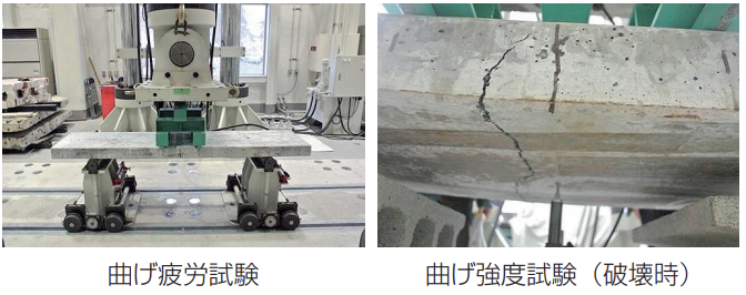 HSモルタルS12製スラブ試験体を用いて曲げ疲労試験を行い、その後、曲げ試験を実施しました。試験荷重(曲げ応力度8.0N/ mm2作用)を200万回載荷しましたが、外観に全く変状は見られず、その後の曲げ強度試験においても、初きれつ及び破壊荷重とも、疲労試験を行わない試験体と同程度の値であり、疲労試験による耐力の低下がないことが確認されました。
