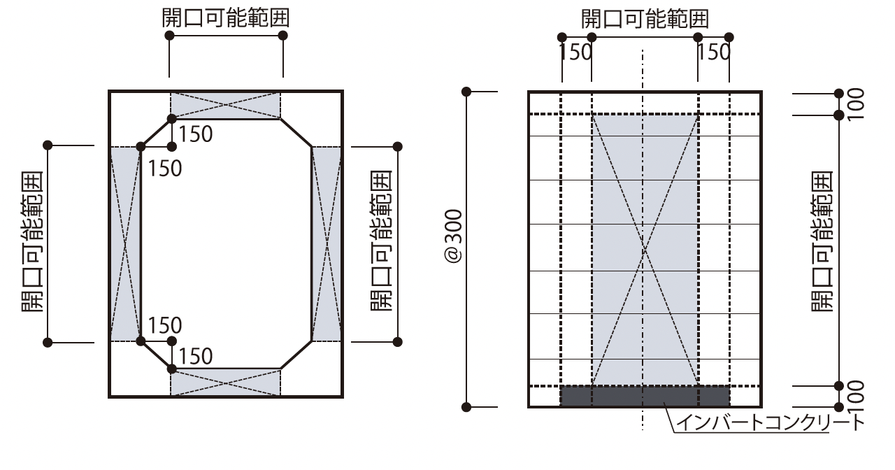 ハンドホール設置後、下図の範囲に後削孔し、任意の形状の開口を設けることが可能です。