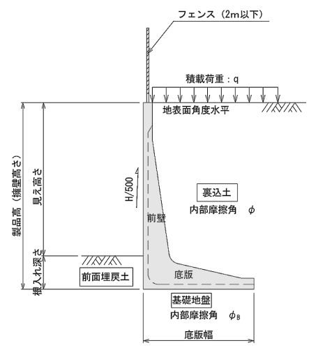 ・製品高さHが4mを超えるものは、内部摩擦角が φB≧30°の基礎地盤が条件です。