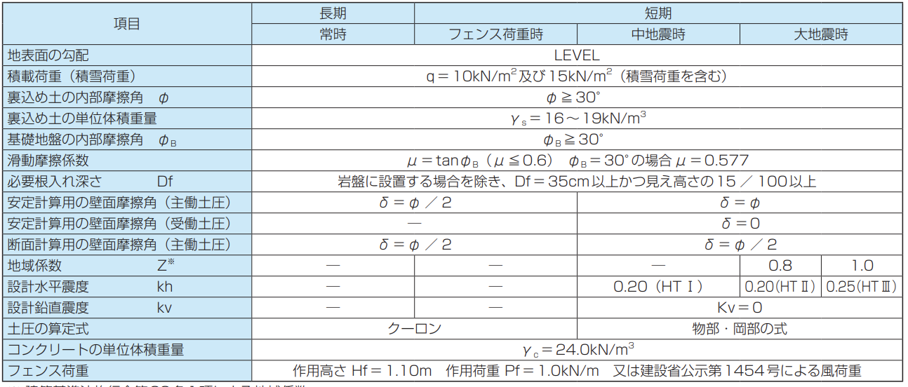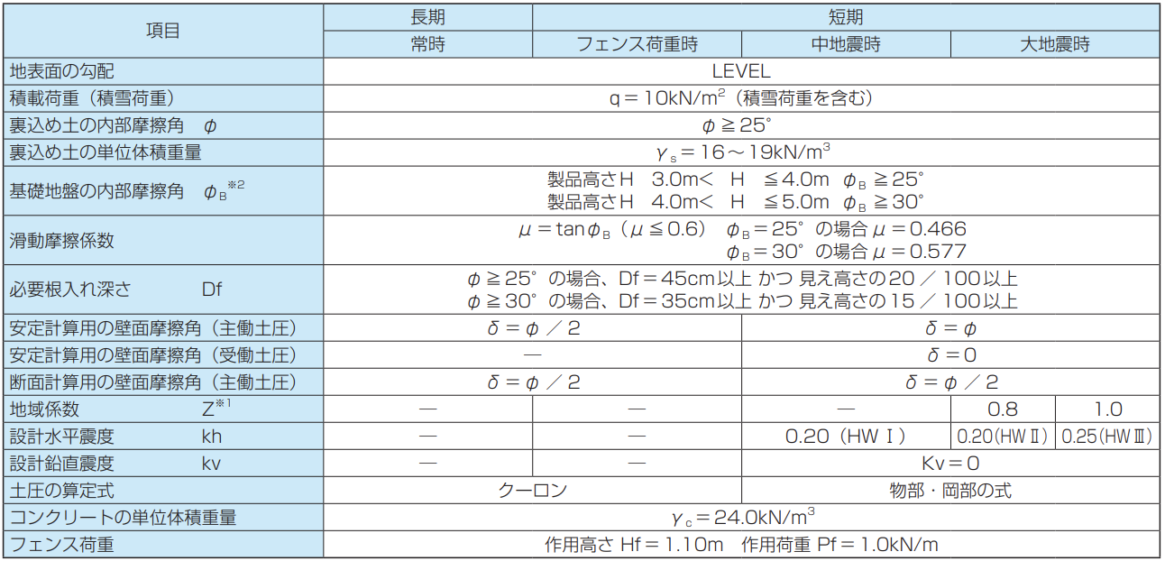 ①本擁壁は、設計載荷重の大きさ、地震時の水平震度、土質条件により、タイプが異なります。施工箇所の条件を十分把握し、 適合するものを選定してください。