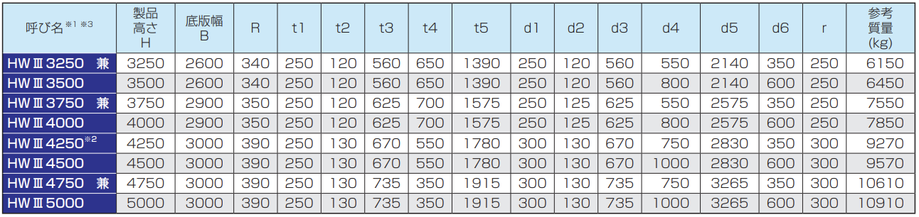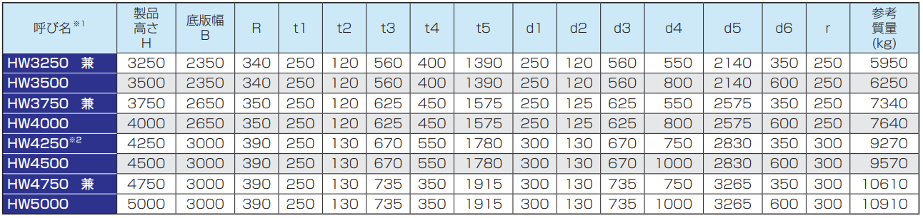 ※2 呼び名HW4250は呼び名HW4500の規格の頭詰めになります。