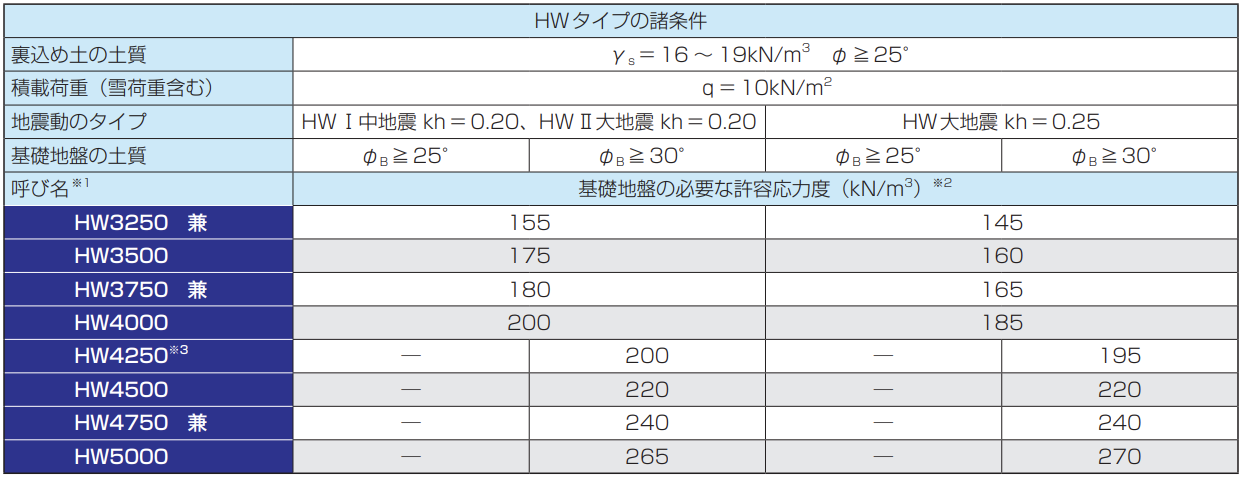 HWタイプ(一般的な地盤:裏込め土の内部摩擦角φ≧25°)