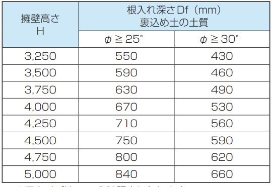 ※2 基礎地盤の内部摩擦角φBは以下のとおりです。 製品高さ3000を超え4000以下 φB≧25°以上 製品高さ4000を超え5000以下 φB≧30°以上が必要です。ご注意願います。