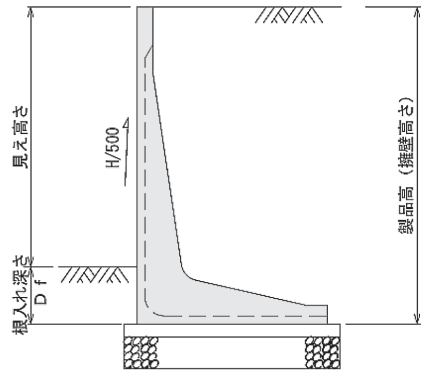 ⑦擁壁前面はH/500の勾配を有していますので、施工時に考慮してください。