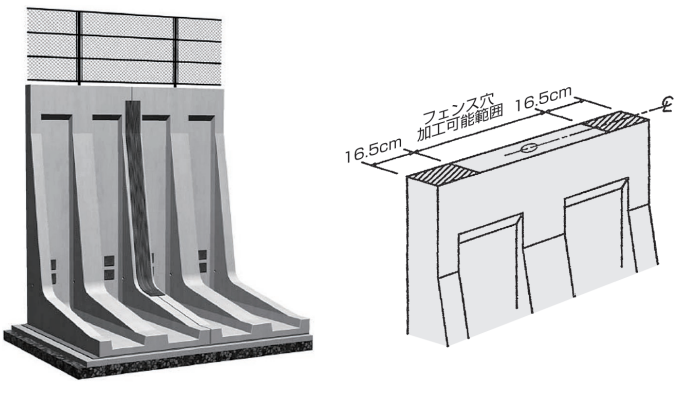 ①ハイ・タッチウォールにフェンスを取り付ける場合は、予め工場で 天端にフェンス支柱を埋込む穴を配置します。