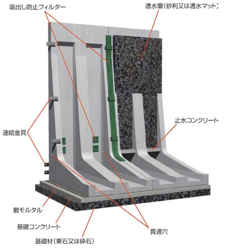 ②擁壁背面の土砂が目地及び水抜穴から流出することを防止 するために、耐食性の吸出し防止フィルターをください。