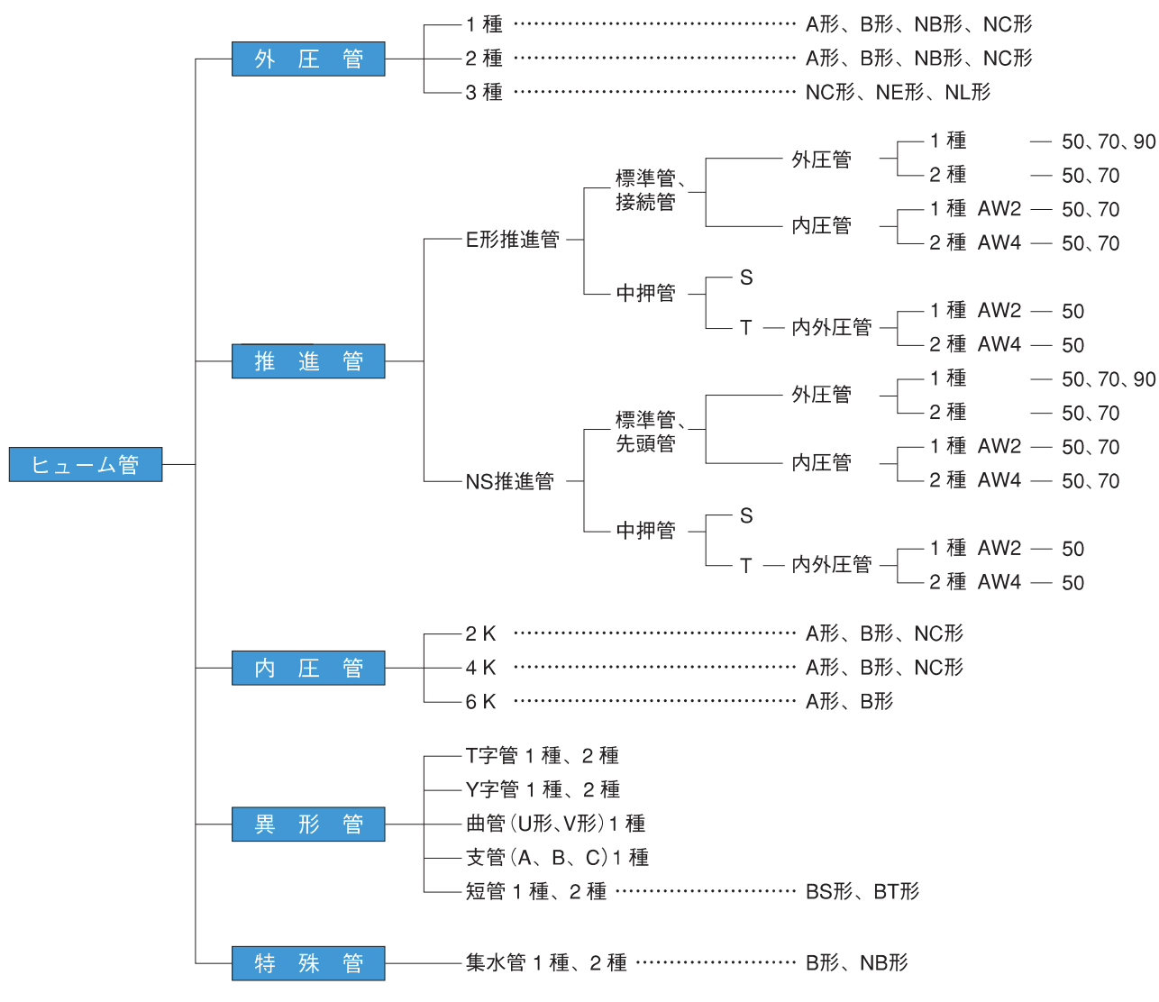ヒューム管は用途及び埋設方法により、外圧管、内圧管及び推進管に大別される。外圧管は継手部の形状によってA形、B形、NB形、NC形、NE形及びNL形、さらに外圧強さによって1種、2種及び3種に区分されます。また推進管は、継手部の形状と性能の違いからE形とNSに、外圧強さにより1種及び2種に、そして軸方向の圧縮強度により50、70に区分されます。以上のほか、それぞれの使用目的によって、T字管、Y字管等の異形管及び集水管等の特殊管があります。