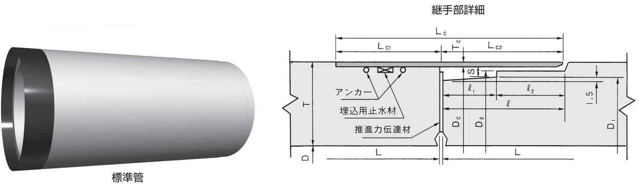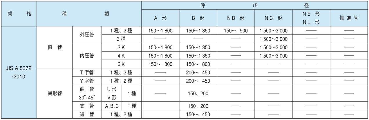 管の規格には、日本工業規格としてJISA5372:2010(附属書C(規定)暗きょ類推奨仕様C-2遠心力鉄筋コンクリート管)、 日本下水道協会規格としてJSWASA-1(下水道用鉄筋コンクリート管)、JSWASA-2(下水道推進工法用鉄筋コンクリート管) 及びJSWASA-6(下水道小口径管推進工法用鉄筋コンクリート管)があります。また、全国ヒューム管協会規格としてJHPAS があります。